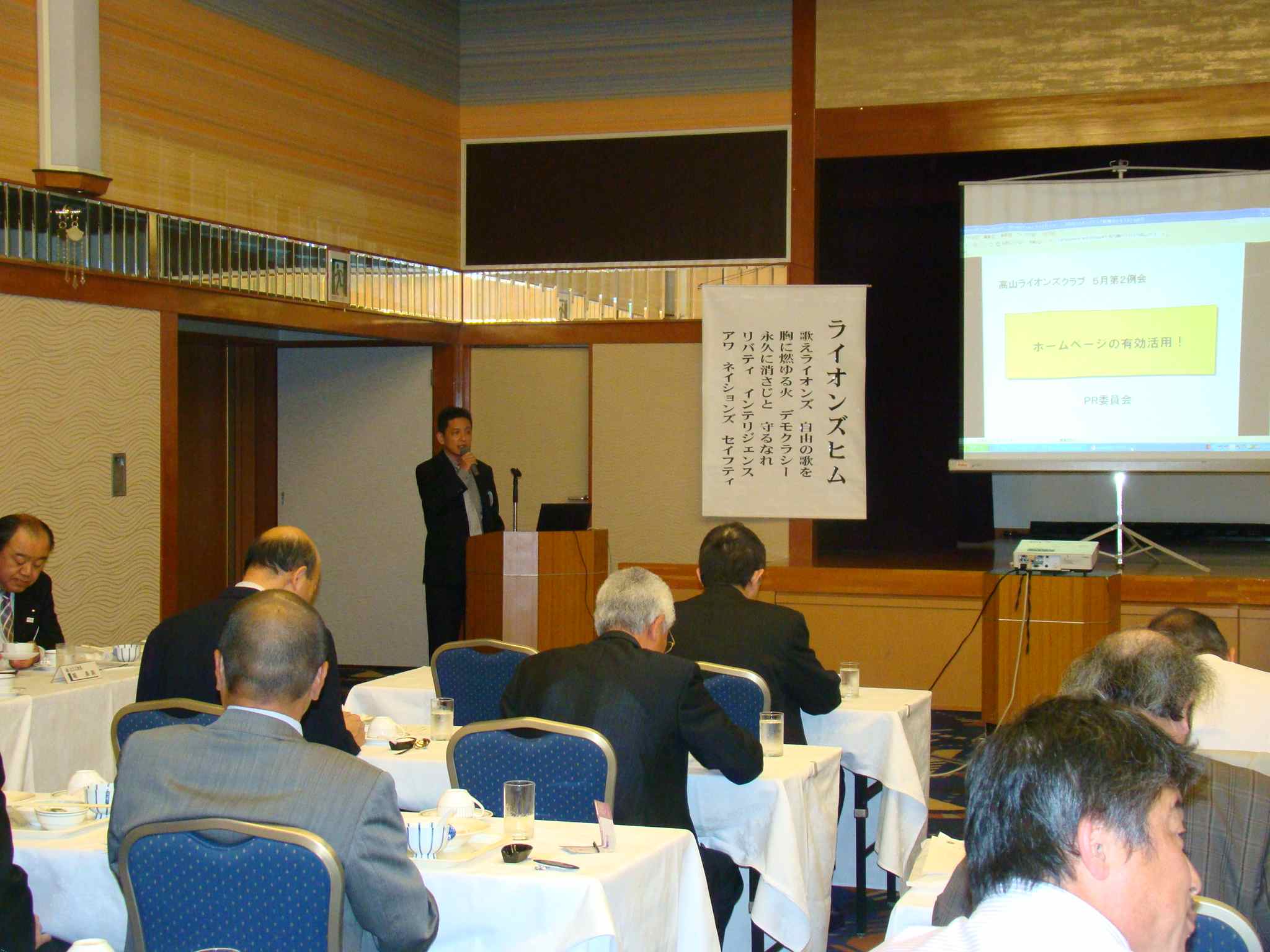 5/19ひだホテルプラザにて5月第2例会がありました。当日は、PR委員会担当で今までの活用をこのホームページで紹介していたところでの紹介や今後の展開等を提案すると言うことで今年度入会いただいた(株)キャディッシュ代表 L.千垣内が専門家の立場で講演していただきました。