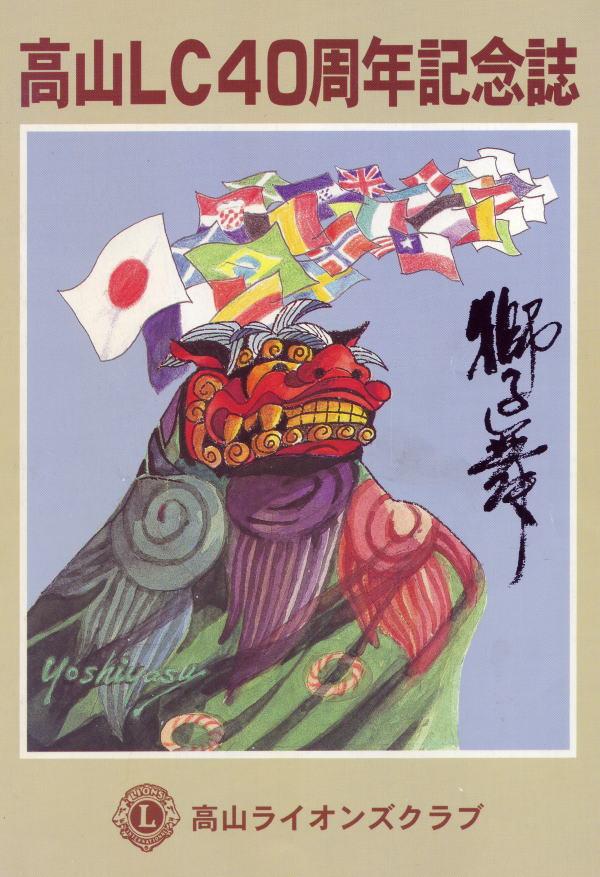 春秋開かれる日本三大祭の一つ、高山祭は絢爛豪華な屋台と裃行列・闘鶏楽に獅子舞が加わって一大絵巻となります。この祭囃子が周囲の山々に谺し、やがて世界の国々まで獅子咆哮(ライオンズ・ローア)として伝わり、ウイ・サーヴの心が通じることを願って描きました。